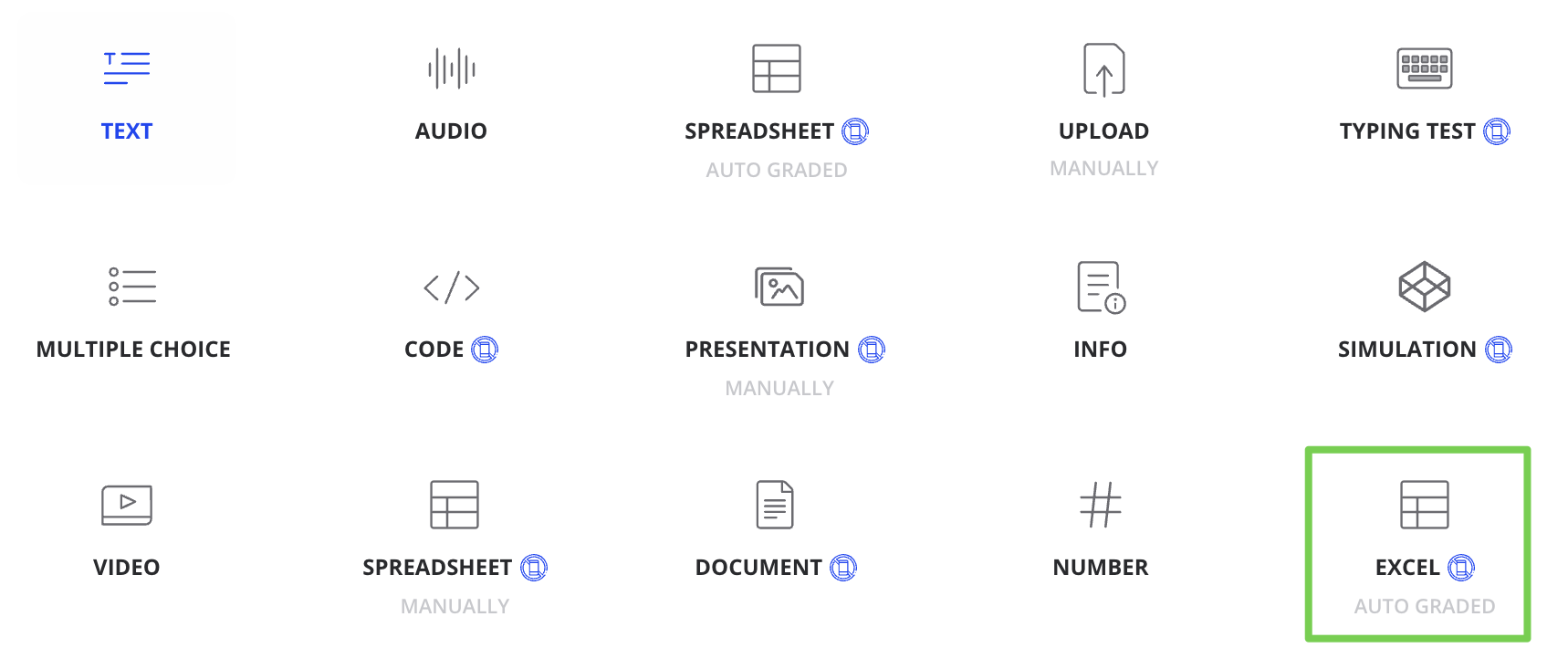 The Excel question type is available to all customers across all plan types and can be accessed through the Create Assessment Editor.