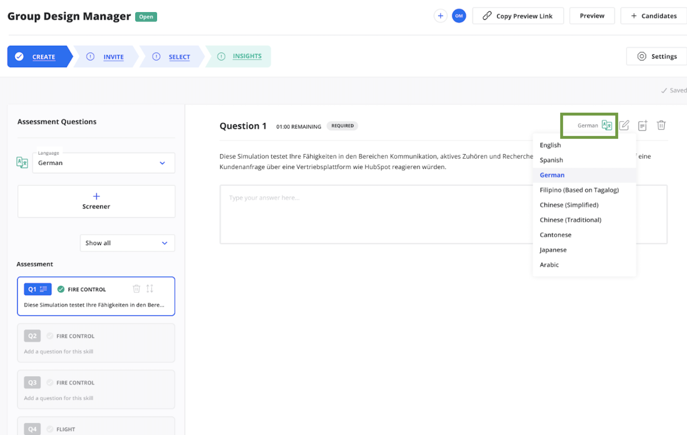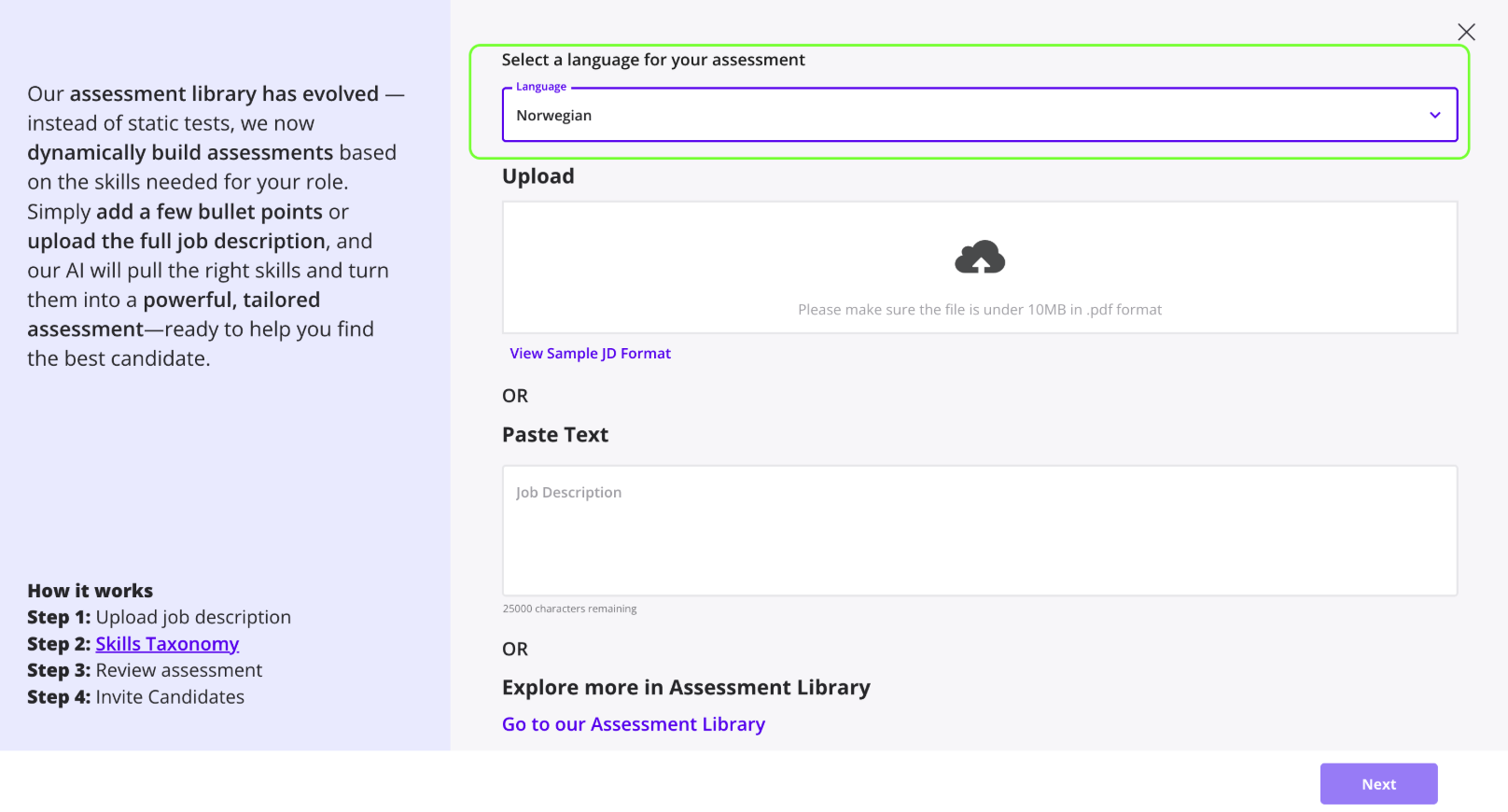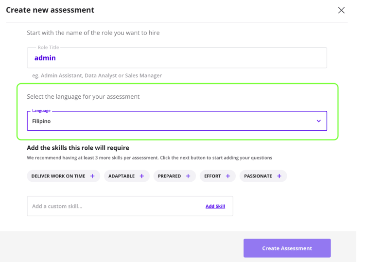 Employers must choose a language when creating a new assessment.Only one language can be selected at a time.